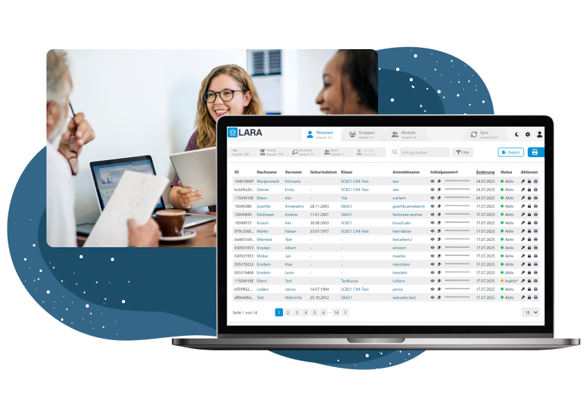 LARA vernetzt Schulverwaltung und digitale Anwendungen zu einem intelligenten Gesamtsystem. Durch die automatische Synchronisation von Stammdaten und Accounts entstehen einheitliche Zugänge für Lehrkräfte, Schüler*innen, Eltern und Betriebe. Alle arbeiten mit nur einem Login in allen relevanten Plattformen, sicher, zuverlässig und ganz ohne zusätzlichen Pflegeaufwand.